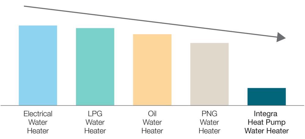 The heat pump is an electrical device that transfers heat from air to water. It does so by capturing the energy from the ambient air to give it back to the heat pump water tank. It uses an intelligent water heating technology that provides water at the ideal temperature in the bathrooms even during bitter winter season. Since it uses electricity to move heat from one place to another, instead of generating heat, the electric consumption is much lower, just one fourth compared to other water heating devices; and so is the operating cost.