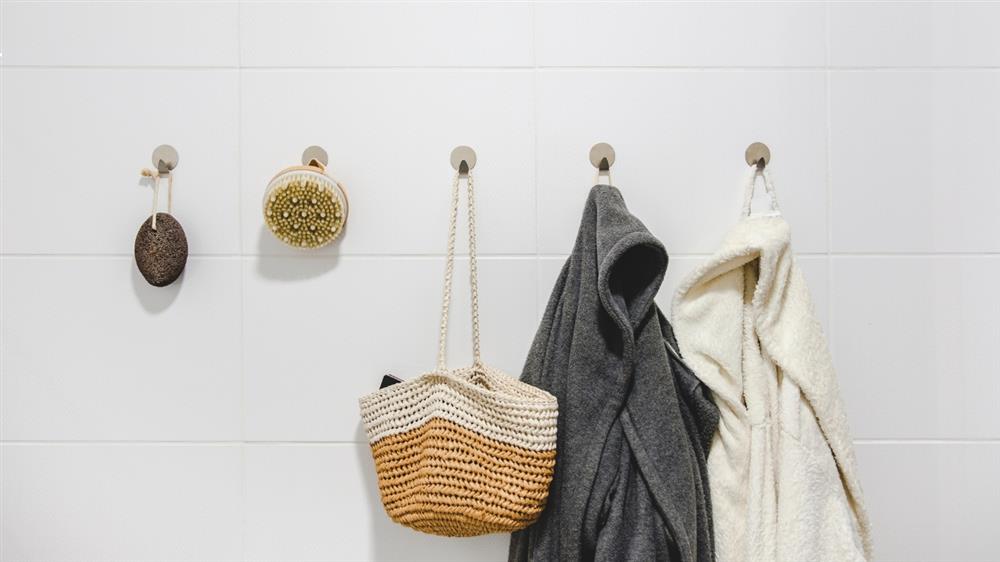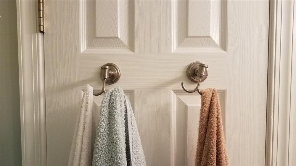 - Choose colorful hooks that double as wall art when not holding towels.