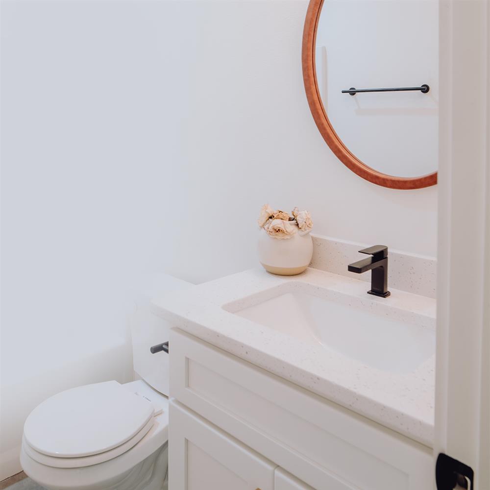 - Add Natural Elements for Sustainable Living: Bring the outdoors in with a powder room that incorporates natural elements. Use wood-look tiles on the floor, add a live plant or two, and choose a sink with organic lines. A statement mirror made of natural materials, such as a driftwood frame, can complete the look.