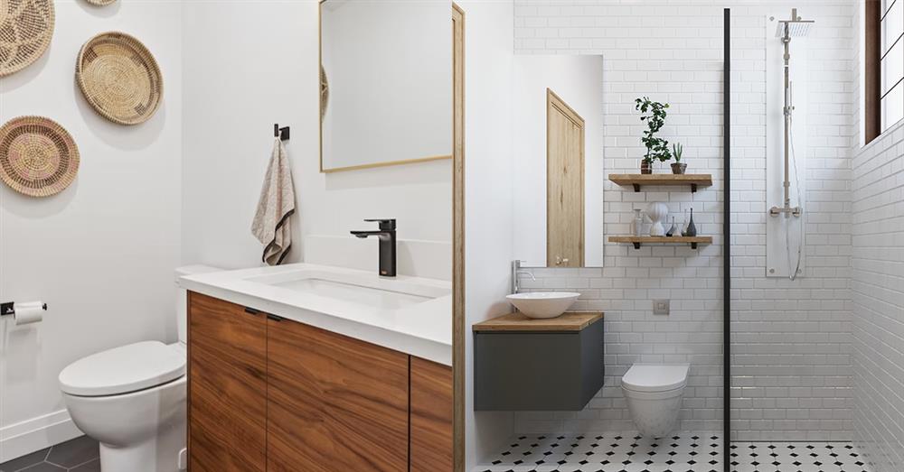 They often feature functional and durable materials, such as tiles or laminate, and may include storage spaces for towels, cleaning supplies, and personal hygiene products. |